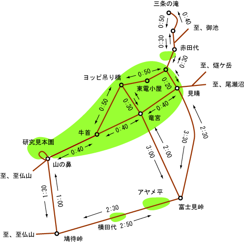 | 最も一般的な入山口としては鳩待峠からになるでしょう。山の鼻まではブナ林のなかを下っていきます。 鳩待峠が標高1590mありますので標高1400mの尾瀬ヶ原にでるには、200mほど下ることになります。 日帰りですと下の大堀か竜宮あたりまで行って帰るようになります。鳩待峠から山の鼻までが約1時間半、山の鼻から竜宮まではゆっくりで約2時間です。 |